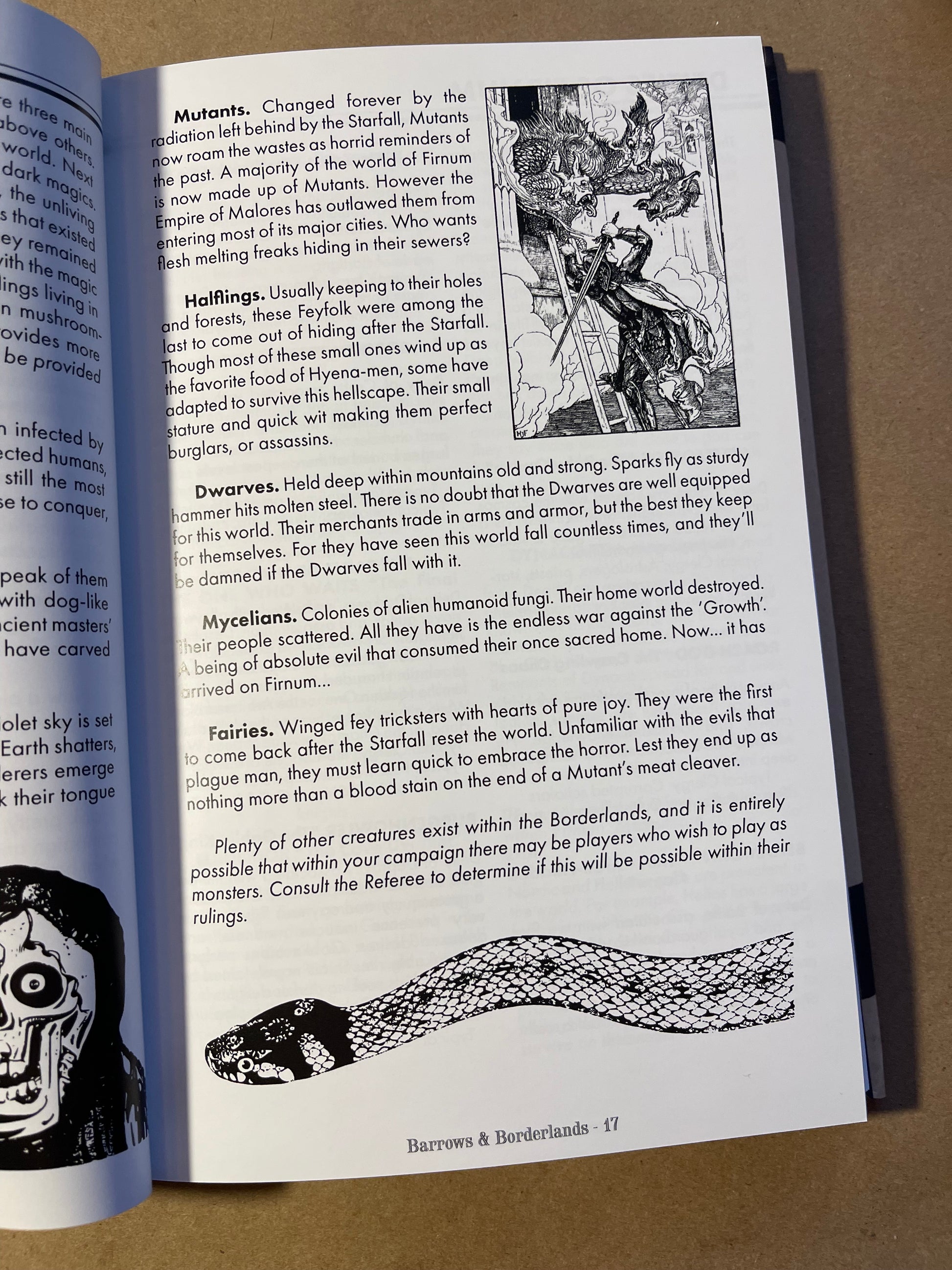 PDFs Come with the Hardcover Barrows & Borderlands started life as my binder of OD&D/1E house‑rules and grew, over two years, into a four‑volume, over 200+ pages On the table it plays like the 70s with a cracked‑reactor glow: flintlocks bark alongside longswords, spell scrolls fizz with fallout, and wyrms coil around dead reactors. System wise it sits halfway between 0E and 1E. What I bolted on are the bits I always wanted at my own table: radiation, mutation tables, a Psychic dueling system, black‑powder rules, and a swingy roll‑to‑cast sorcery based on chainmail that can blow up in your face.
